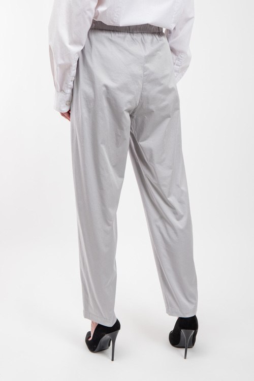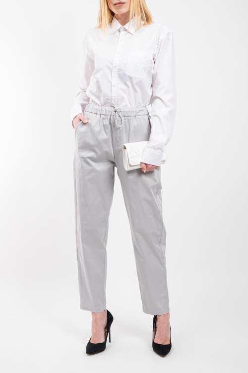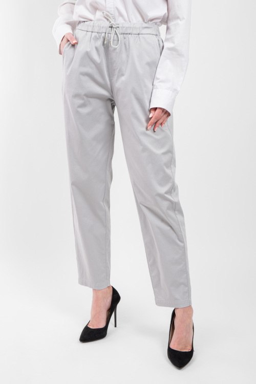 Женские серые брюки из хлопкового микса от Panicale Cashmere (Паникале Кашемир). Высокая посадка, эластичная резинка на поясе с кулиской, прорезные карманы, зауженный крой. Замеры для размера 44: длина: 103 см, ширина по поясу (резинка): 38 см, ширина по бедрам: 50 см, ширина штанины вверху: 33 см, высота сидения: 37 см.