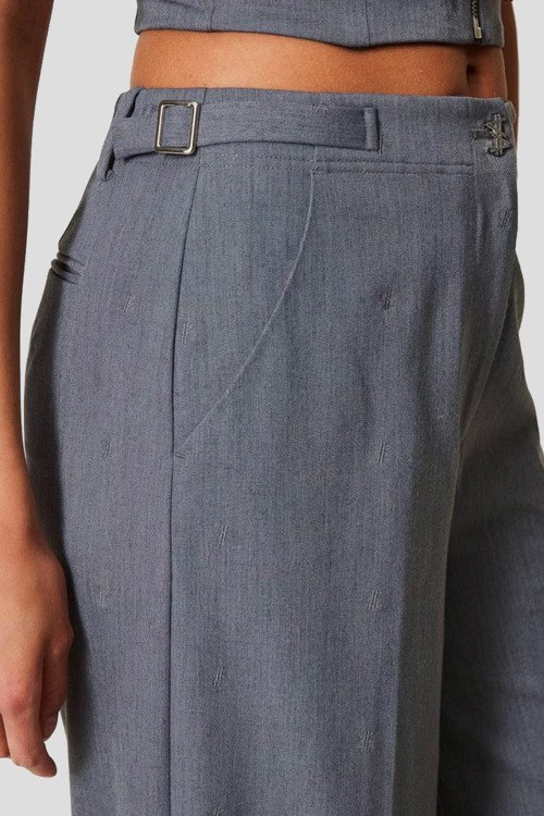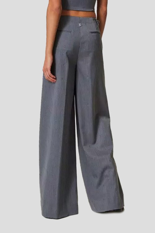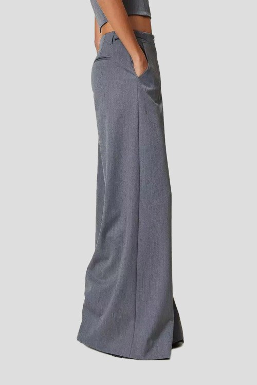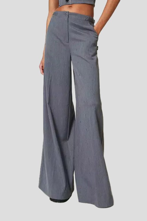 Женские серые брюки-палаццо из смесовой вискозы Myfo от TWINSET (Твинсет). Модель ограниченной серии за подписью художника Myfo для коллекции Actitude. Расшиты символом доллара по всей поверхности, имеют застежку на молнию и металлическую пуговицу с логотипом, ремешки на пряжках для регулировки по талии, косые карманы и защипы для придания объема, а также заутюженную стрелку