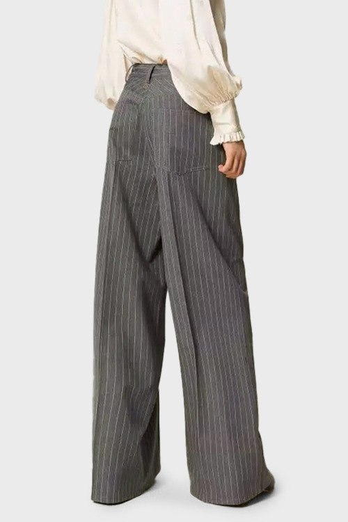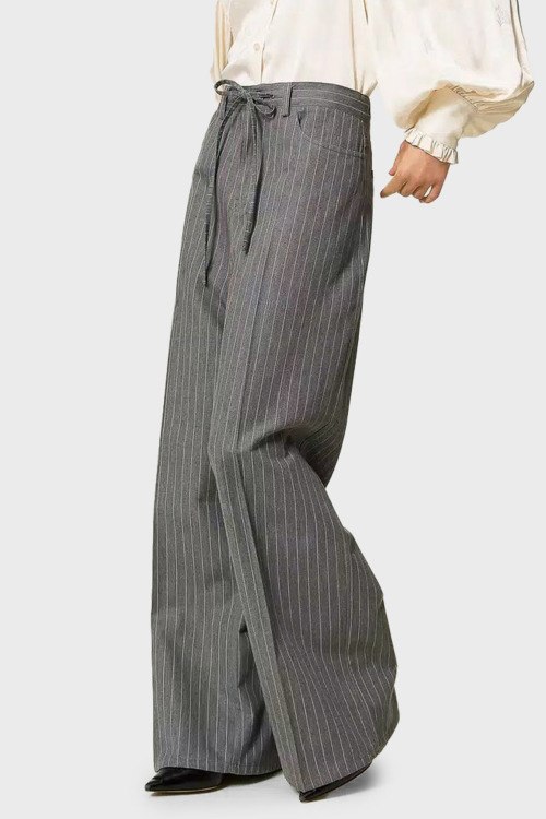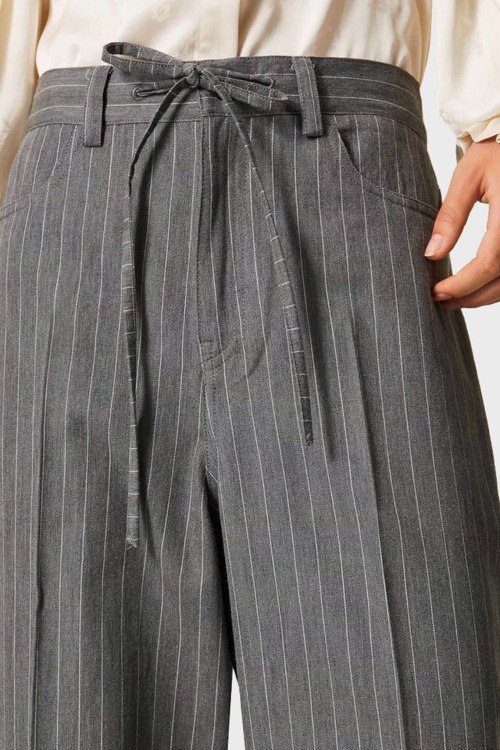 Детали: Женские серые брюки из хлопка и шерсти от TWINSET (Твинсет). Дизайн со стрелками, тонкая полоска по всей поверхности, в поясе с петлями для ремня и на завязках, передние и задние карманы, широкий крой, полная длина