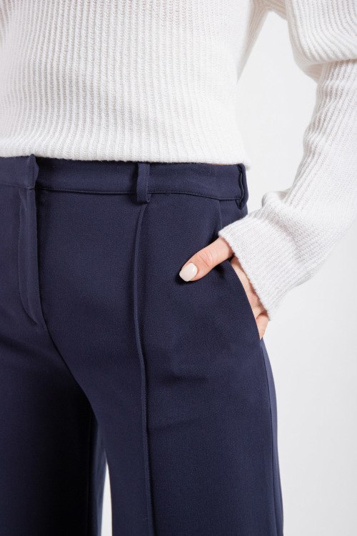 Женские темно-синие брюки-палаццо из полиэстера и вискозы от NIU (Ниу). Расклешенная модель, высокая посадка, застежка на молнию и пуговицу, боковые карманы, петли в поясе для ремня. вы можете дополнить образ темно-синим жакетом.