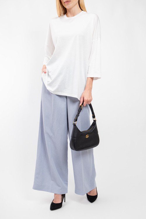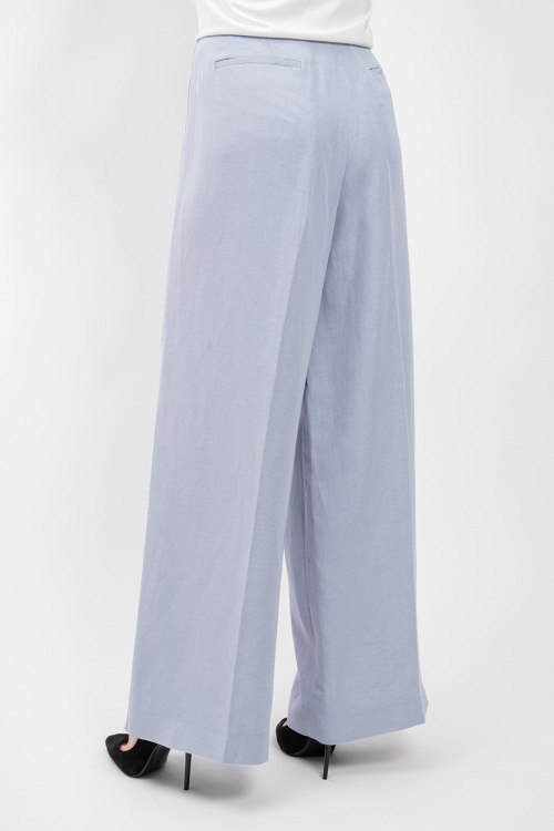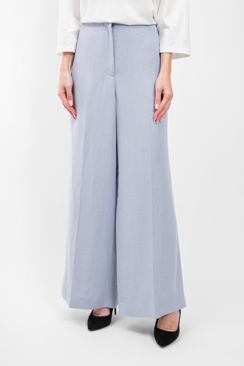 Женские сиреневые брюки-палаццо из вискозы и льна от Fabiana Filippi (Фабиана Филиппи). Дизайн со стрелками, боковые и задние карманы, широкий крой, полная длина. Замеры для размера 46: Длина: 111 см, ширина штанины вверху: 39 см, ширина по поясу: 44 см, ширина по бёдрам: 53 см, высота сидения: 42 см.