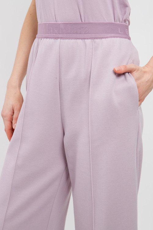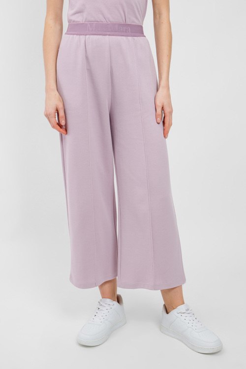Женские лиловые брюки из хлопкового микса от Max Mara (Макс Мара). Укороченная длина, высокая посадка, эластичная резинка на поясе, прорезные карманы, расклешенная модель.