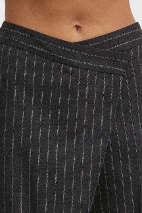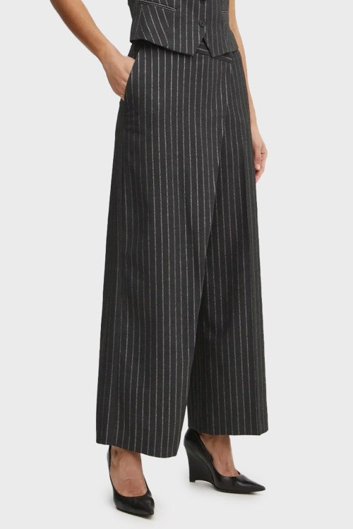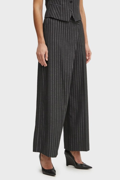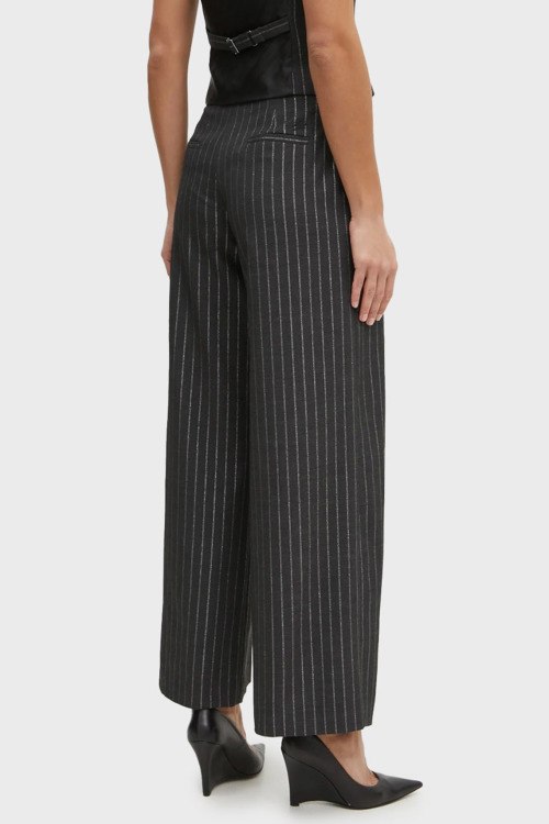 Детали: Женские темно-серые брюки из полиэстера, вискозы, шерсти и эластана от Karl Lagerfeld (Карл Лагерфельд). Классическая длина, модель в полоску с люрексовой нитью, прорезные карманы, расклешенная модель