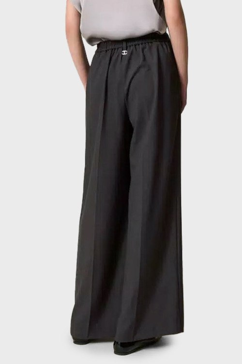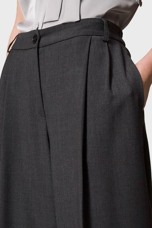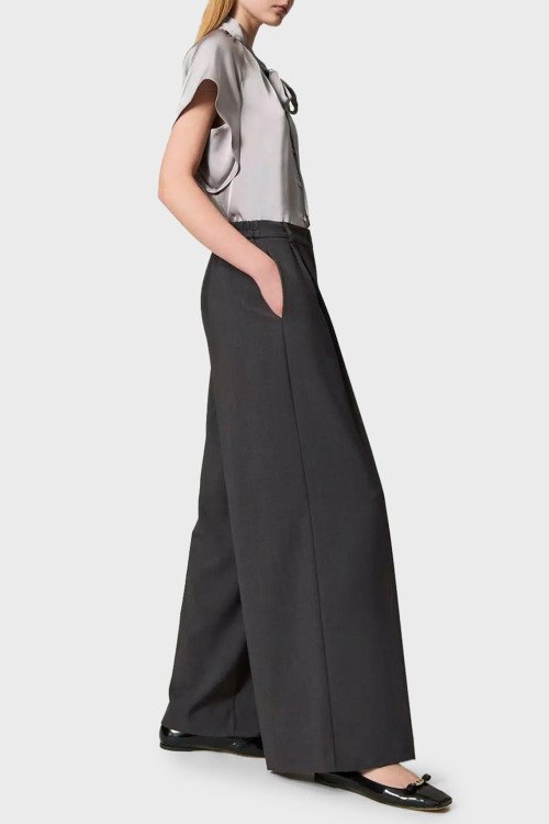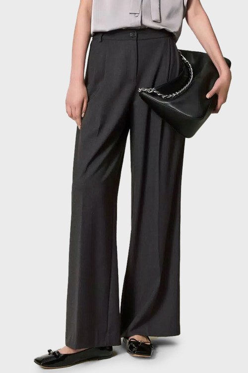 Детали: Женские темно-серые широкие брюки от TWINSET (Твинсет). Дизайн со стрелками, пояс с петлями для ремня, нашивка с логотипом сзади на поясе, боковые карманы, широкий крой, полная длина