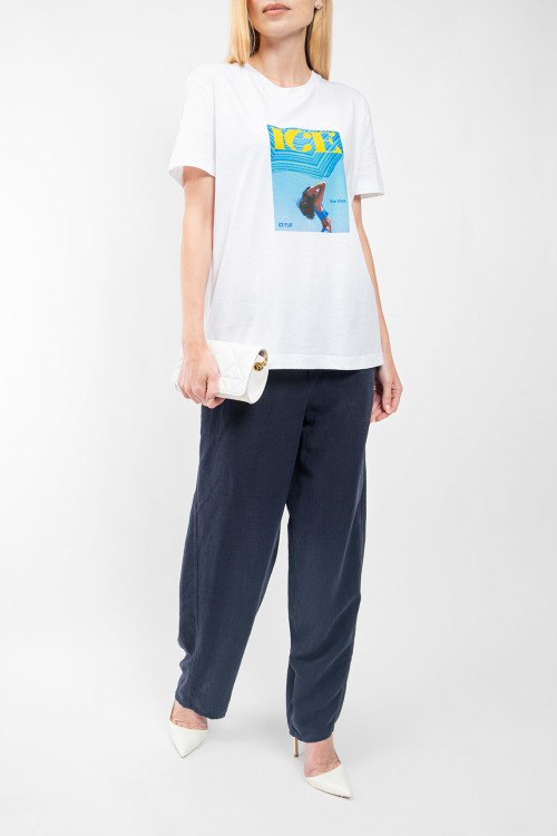 Женские темно-синие брюки из лиоцелла и льна от Deha (Деха). Пояс на резинке, нашивка с логотипом сзади, боковые карманы, широкий крой, полная длина.
