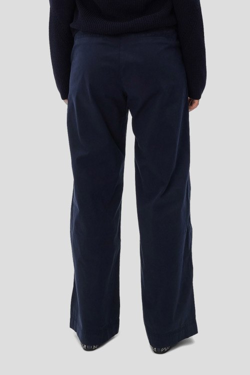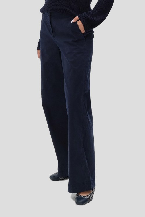 Детали: Женские темно-синие хлопковые широкие брюки от Hugo Boss (Хуго Босс). Боковые карманы, широкий крой, полная длина