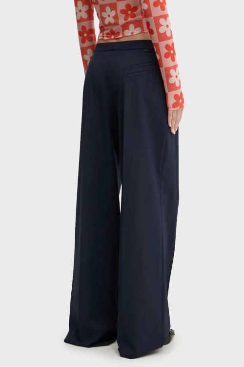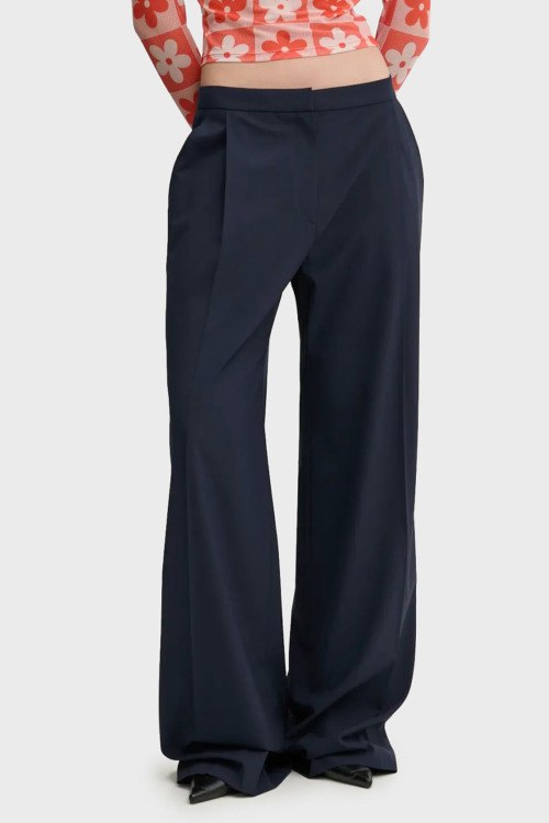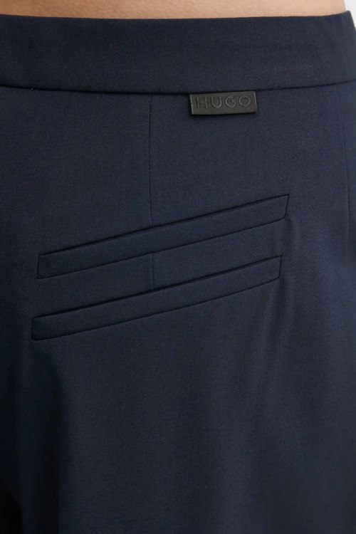 Детали: Женские темно-синие брюки-палаццо Hemmes из вискозного микса от Hugo Boss (Хуго Босс). Высокая посадка, застежка на молнию и крючки, прорезные карманы, расклешенная модель