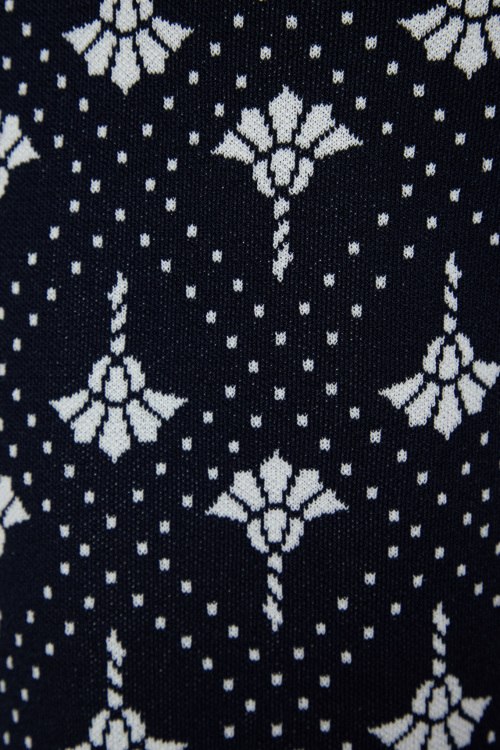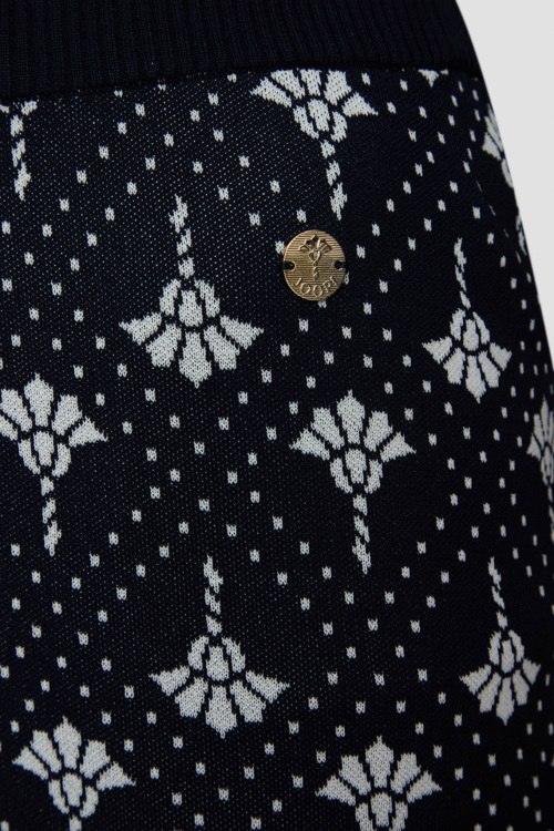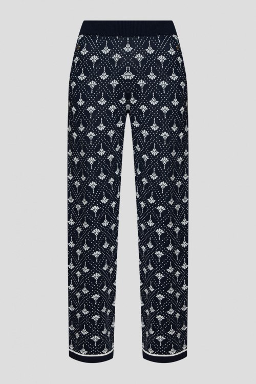 Детали: Женские темно-синие трикотажные брюки от Joop! (Йооп!). Узор по всей поверхности, эластичный пояс, полная длина. Обхват пояса: для размера 36 - 72 см, обхват бедер: для размера 36 - 96 см, длина штанины: для размера 36 - 102 см, длина по шаговому шву: для размера 36 - 76 см