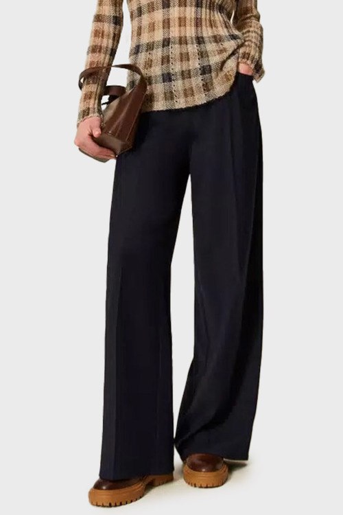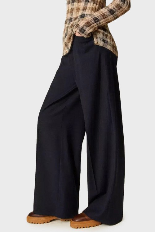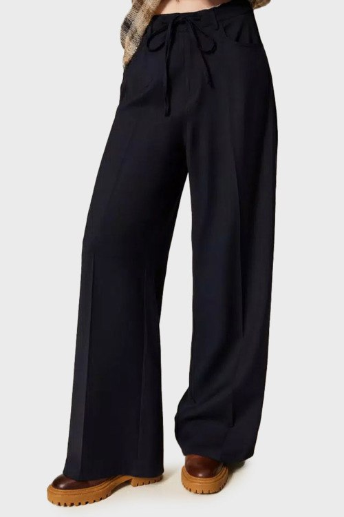 Детали: Женские темно-синие брюки с примесью шерсти от TWINSET (Твинсет). Дизайн со стрелками, передние и задние карманы, в поясе с петлями для ремня и на завязках, широкий крой, полная длина