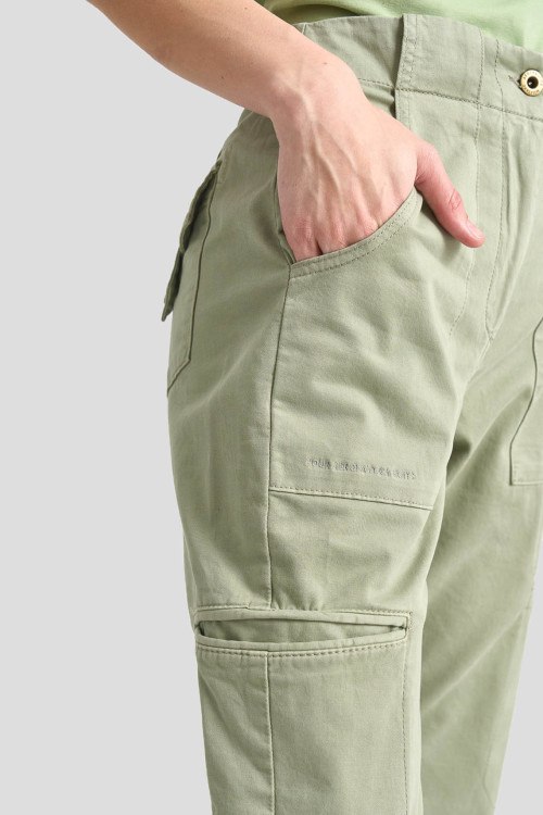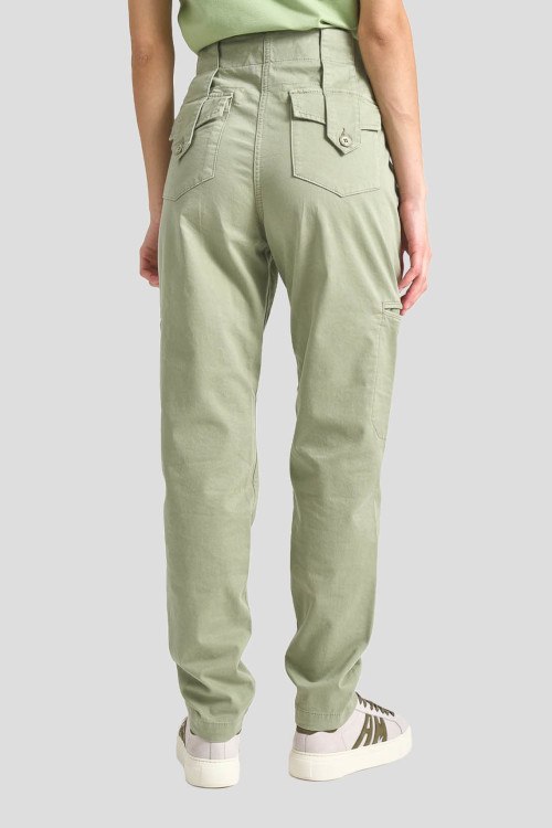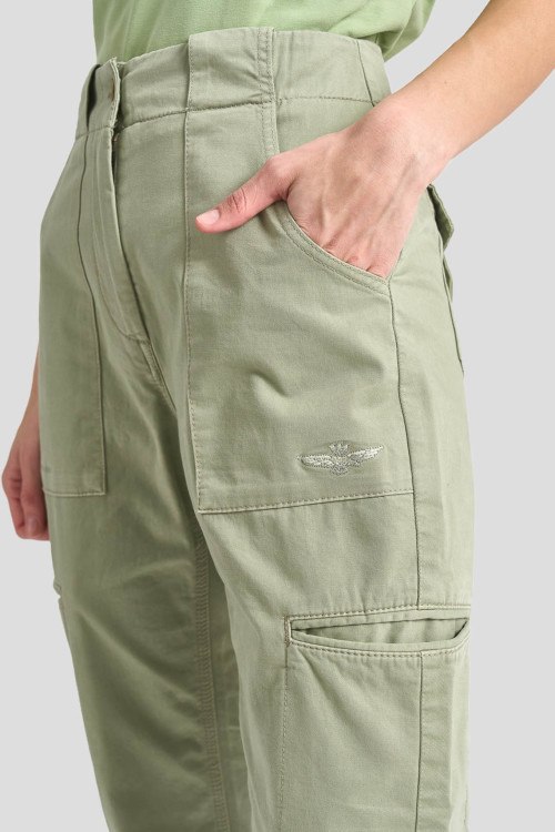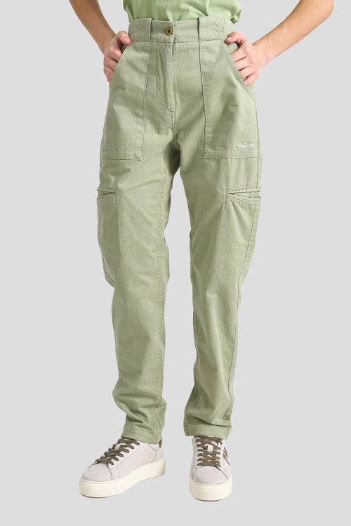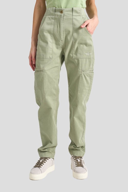 Детали: Женские светло-зеленые брюки-карго из хлопкового микса от Aeronautica Militare (Аэронавтика Милитари). Классическая длина, модель с высокой посадкой, застежка на молнию и пуговицу, шесть карманов, вышитый логотип бренда, петли в поясе для ремня
