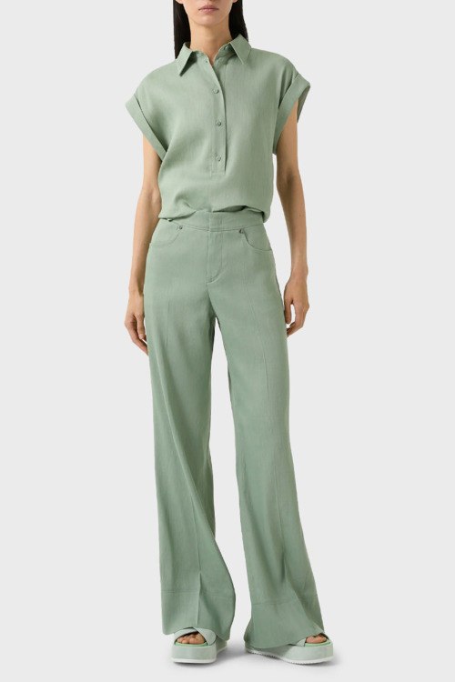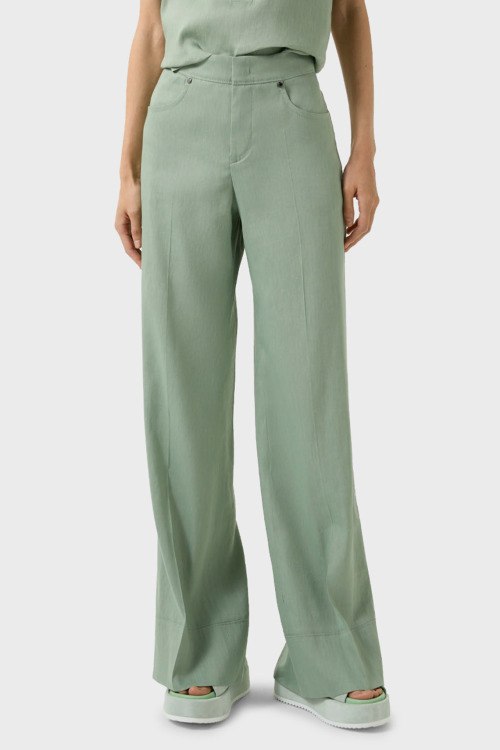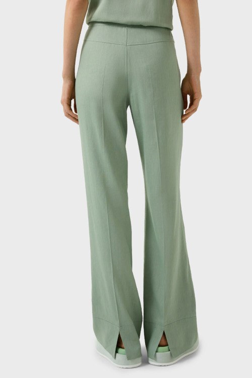 Детали: Женские зеленые брюки Rayen из льняного микса от Bogner (Богнер). Классическая длина, средняя посадка, застежка на молнию, прорезные карманы, расклешенный крой, разрезы на манжетах