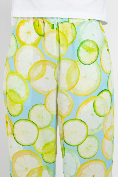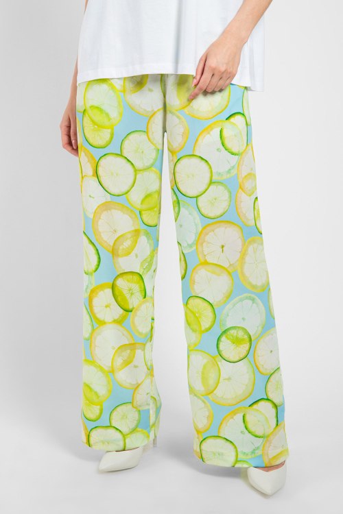 Женские зеленые брюки из полиэстера от Ice Play (Айс Плей). Прямой крой, свободный фасон, пояс на эластичной резинке, по бокам карманы, принт по всей поверхности изделия