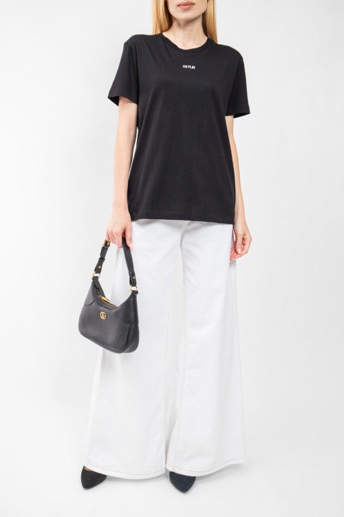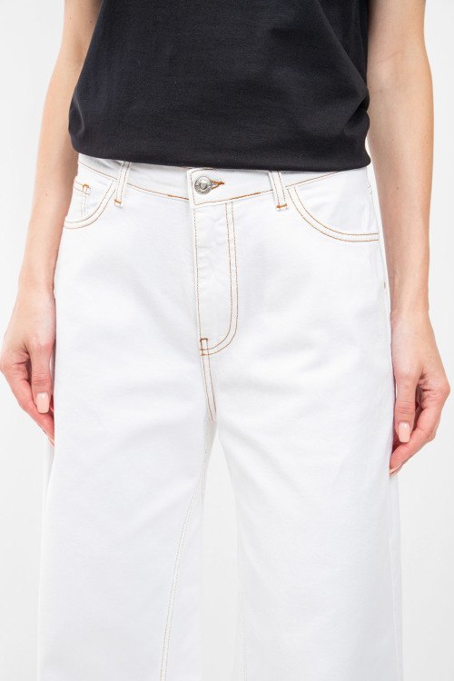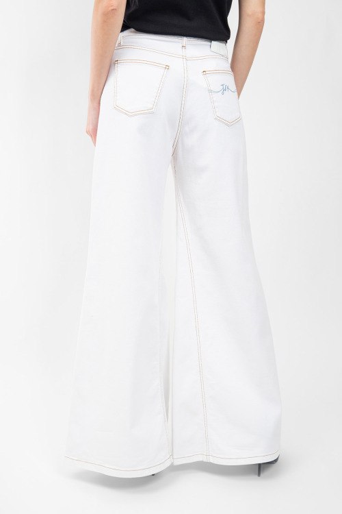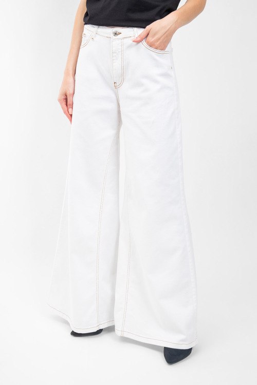Женские белые джинсы-палаццо от J.B4 Just Before (Джаст Бифо). Пяти-карманная модель, пояс с петлями для ремня, нашивка с логотипом сзади на поясе, широкий крой, полная длина.