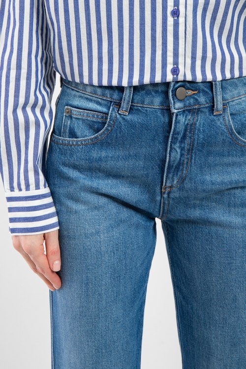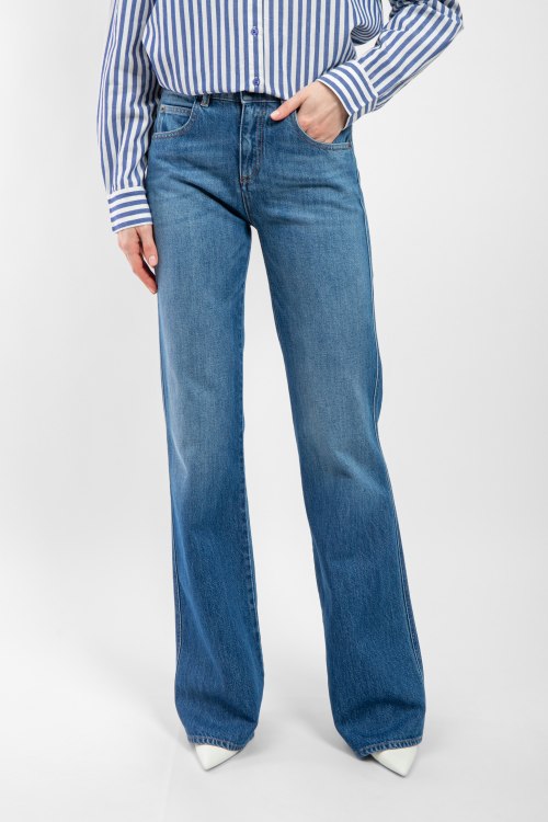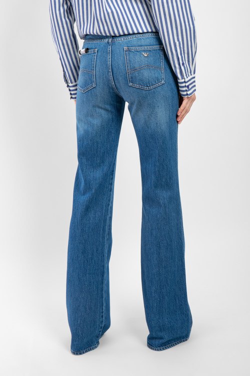 Детали: Женские голубые джинсы из хлопка от Armani (Армани). Классическая длина, средняя посадка, застежка на молнию и пуговицу, расклешенная модель, пять карманов, петли в поясе для ремня, патч-лого
