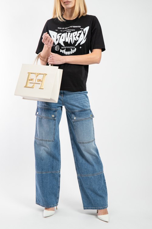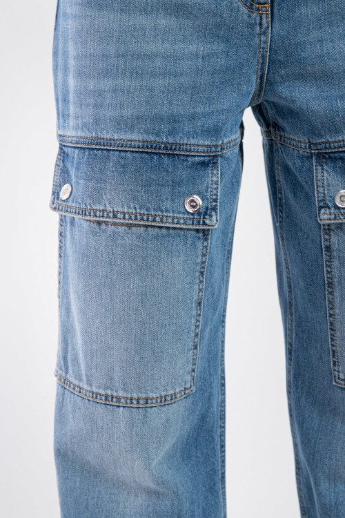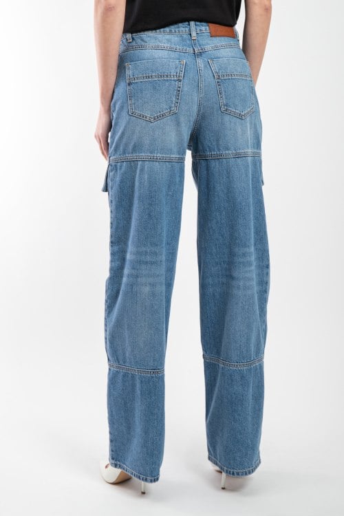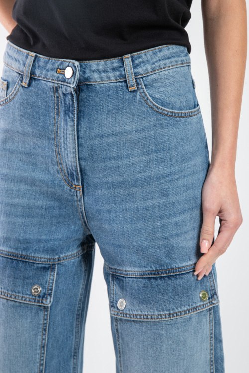 Женские голубые джинсы-карго от Elisabetta Franchi (Елизабетта Франчи). Пяти-карманная модель, пояс с петлями для ремня, нашивка с логотипом сзади на поясе, передние накладные карманы, широкий крой, полная длина.