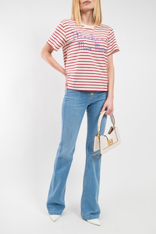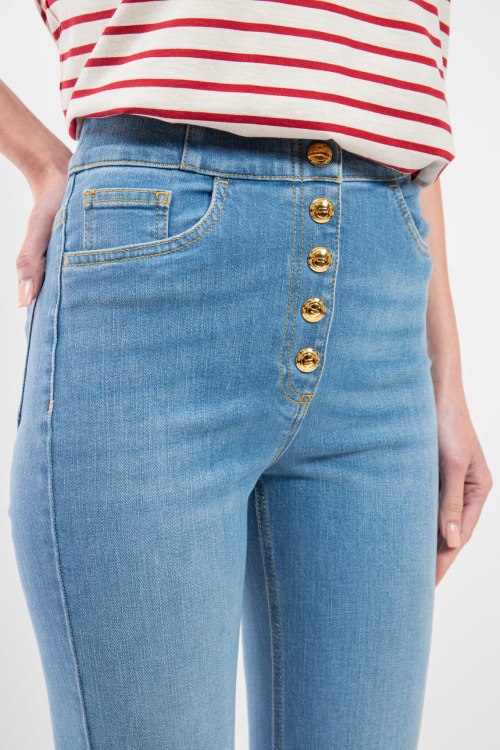 Женские голубые джинсы от Elisabetta Franchi (Елизабетта Франчи). Пяти-карманная модель, высокая талия, застежка на золотистые пуговицы, расклешенный крой к низу, полная длина.