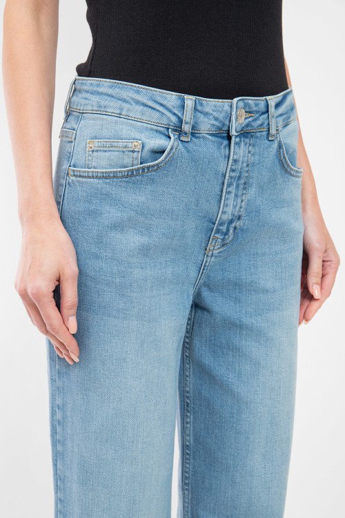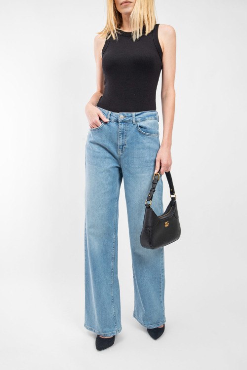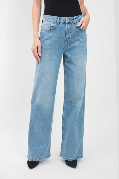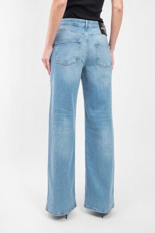 Детали: Женские голубые джинсы Wide Leg от Ice Play (Айс Плей). Пяти-карманная модель, пояс с петлями для ремня, нашивка с логотипом сзади на поясе, широкий крой, полная длина