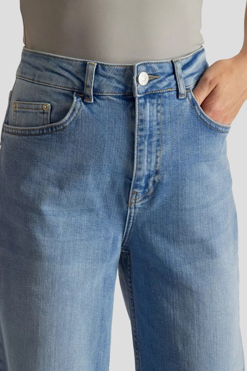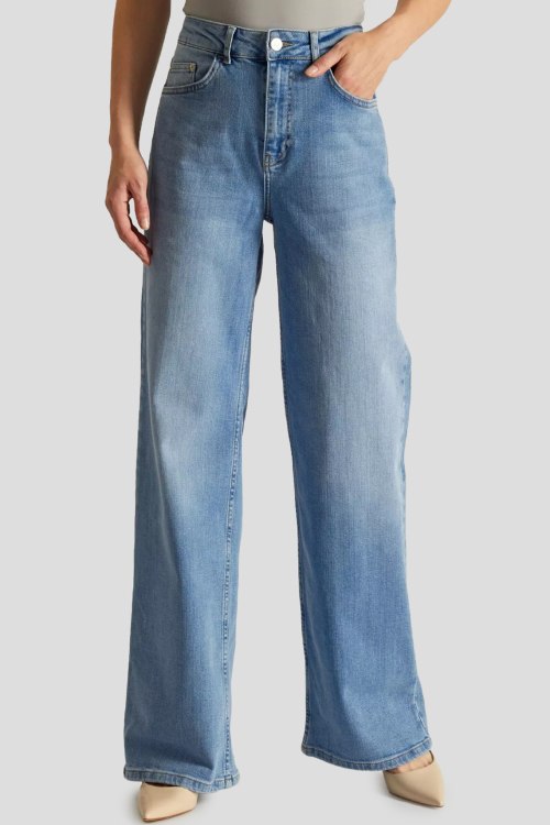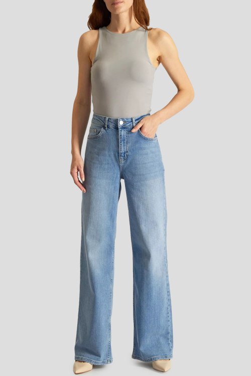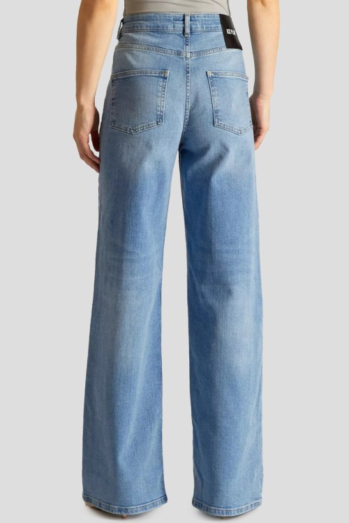 Детали: Женские голубые широкие джинсы от Ice Play (Айс Плей). Пяти-карманная модель, дизайн с потертостями, пояс с петлями для ремня, нашивка с логотипом сзади на поясе, широкий крой, полная длина