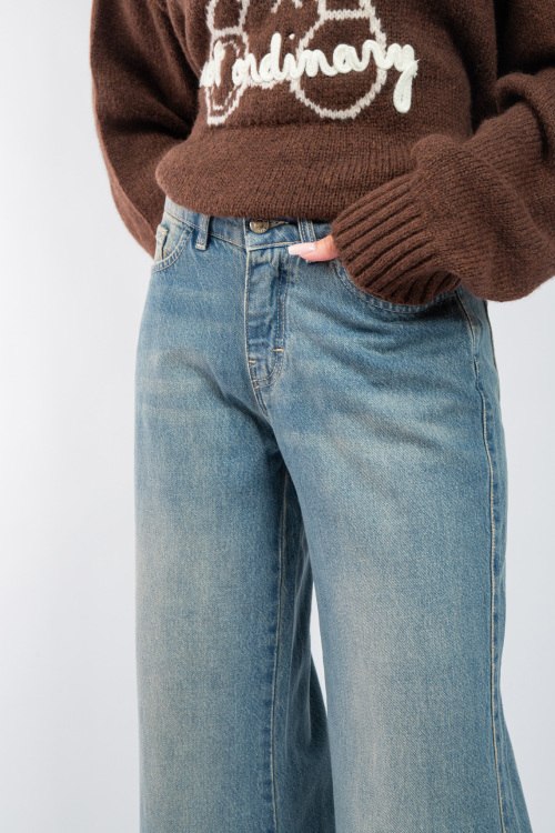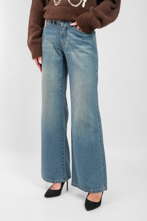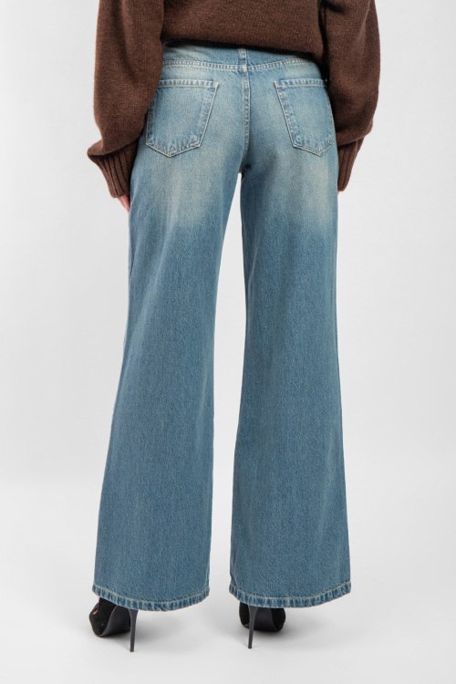 Женские голубые широкие джинсы от J.B4 Just Before (Джаст Бифо). Пяти-карманная модель, дизайн с потертостями, пояс с петлями для ремня, широкий крой, полная длина.