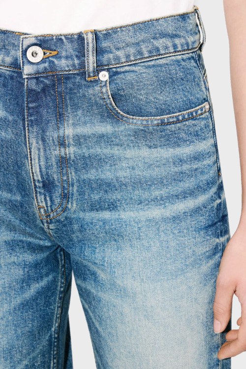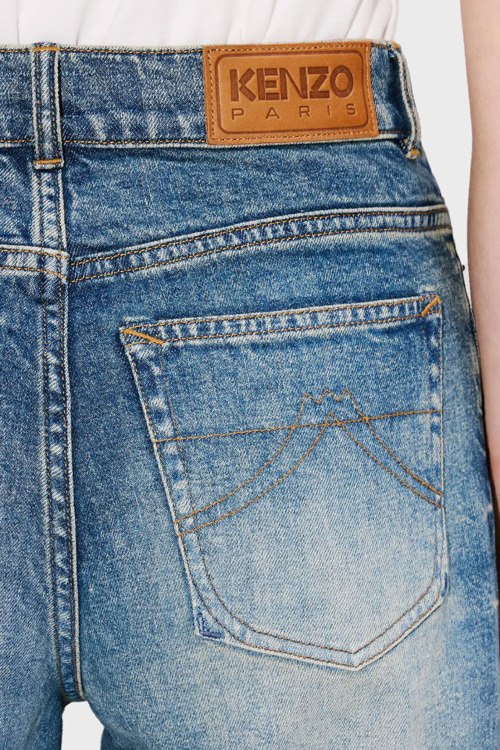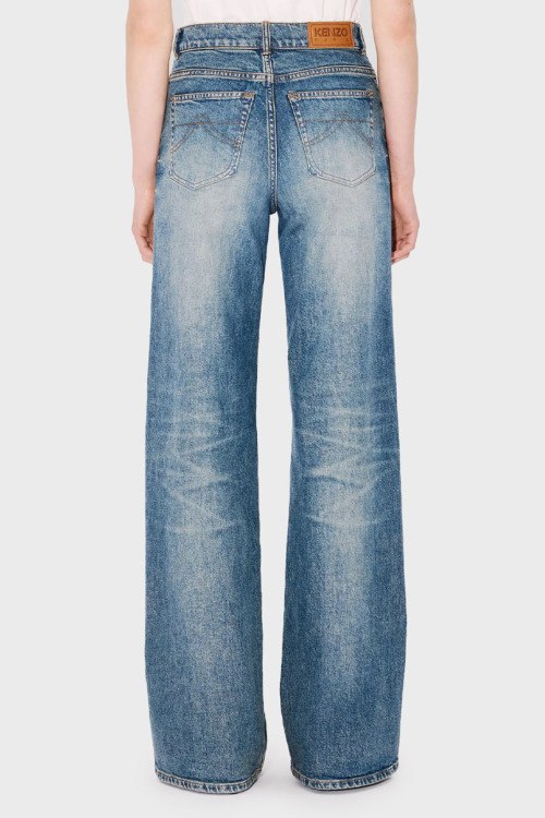 Детали: Женские голубые джинсы Ayame от Kenzo (Кензо). Пяти-карманная модель, дизайн с потертостями, пояс с петлями для ремня, нашивка с логотипом сзади на поясе, широкий крой, полная длина