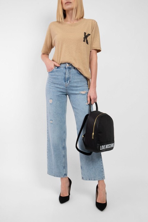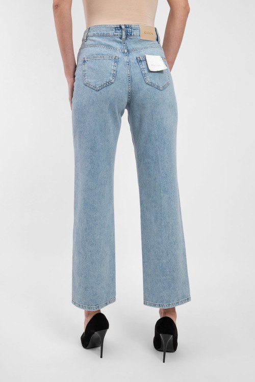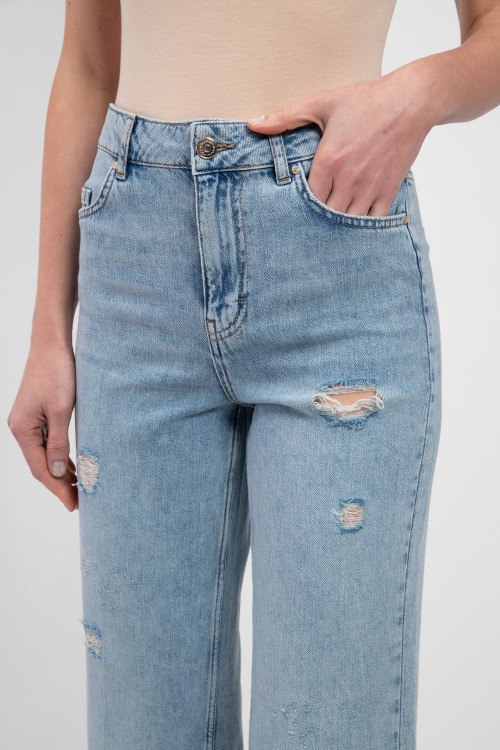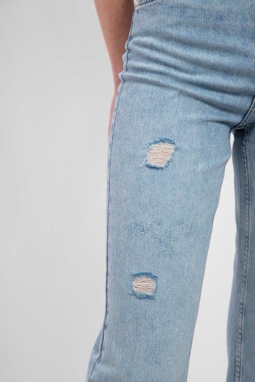 Женские голубые джинсы из хлопка от Kocca (Кокка). Модель умеренно широкая. Укороченная длина, средняя посадка, застежка на молнию и пуговицу, пять карманов, петли в поясе для ремня, патч-лого, дизайн с потертостями и небольшими дырами.