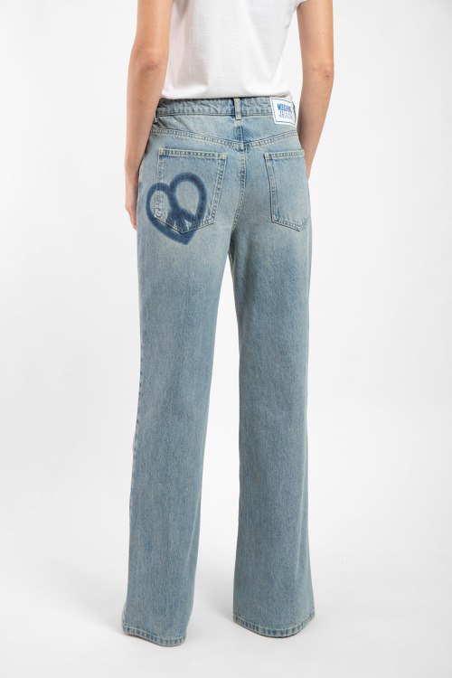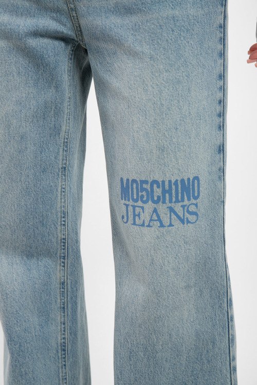 Детали: Женские голубые джинсы из хлопка от Moschino (Москино). Классическая длина, расклешенная модель, застежка на молнию и пуговицу, средняя посадка, четыре кармана, петли в поясе для ремня, патч-лого