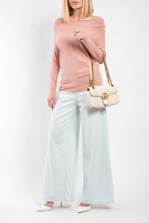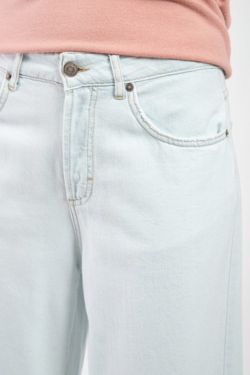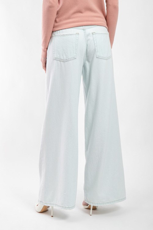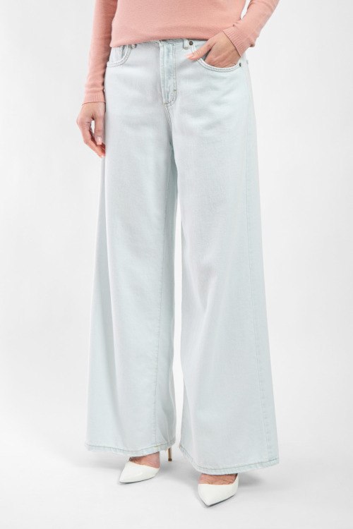 Женские голубые джинсы из хлопкового микса от Vicolo (Виколо). Классическая длина, средняя посадка, застежка на молнию и пуговицу, четыре кармана, петли в поясе для ремня, расклешенная модель. Замеры для размера M: длина 110 см, ширина по талии: 39 см, ширина по бедрам: 49 см, высота сидения: 36 см, ширина штанины вверху: 32 см. Ткань не тянется.