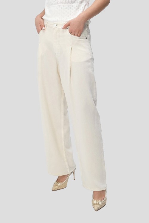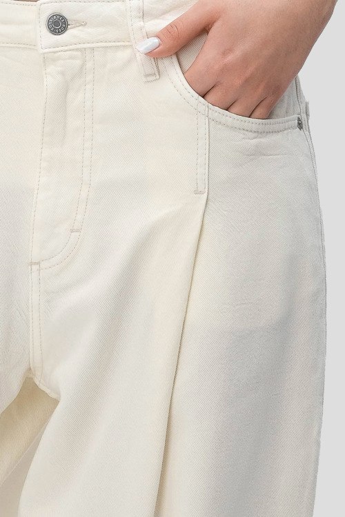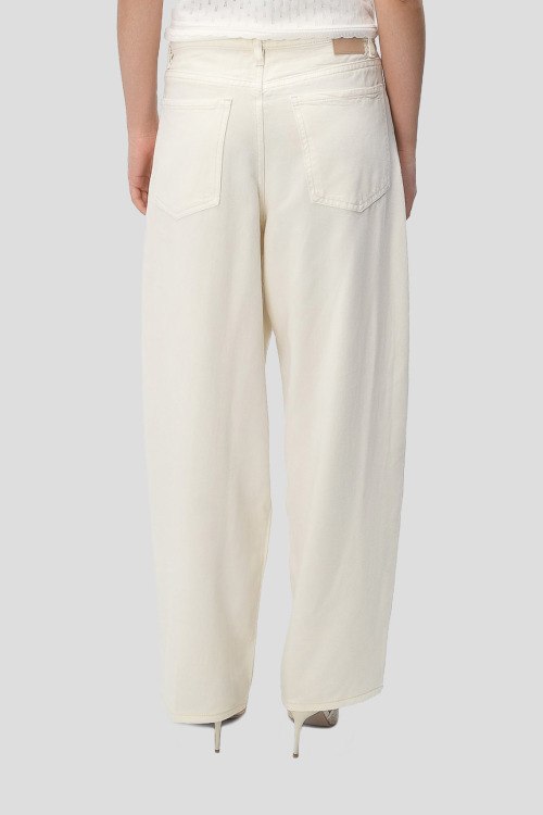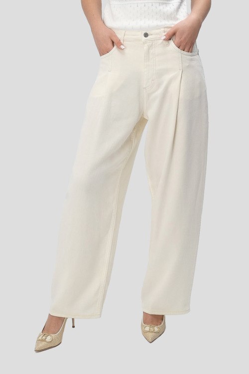 Детали: Женские кремовые джинсы Slouchy от Hugo Boss (Хуго Босс). Пяти-карманная модель, пояс с петлями для ремня, нашивка с логотипом сзади на поясе, широкий крой, полная длина