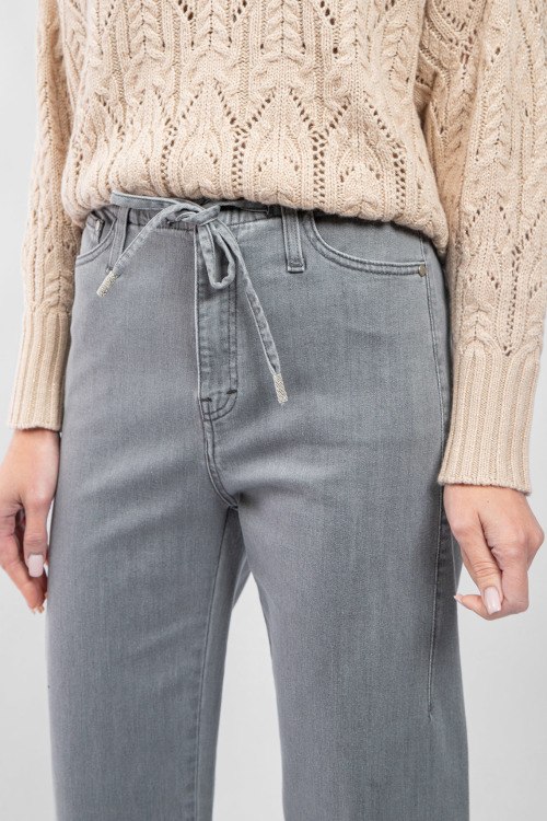 Женские серые широкие джинсы от Panicale Cashmere (Паникале Кашемир). Пяти-карманная модель, в поясе с петлями для ремня и на завязках, широкий крой, длина до щиколотки.