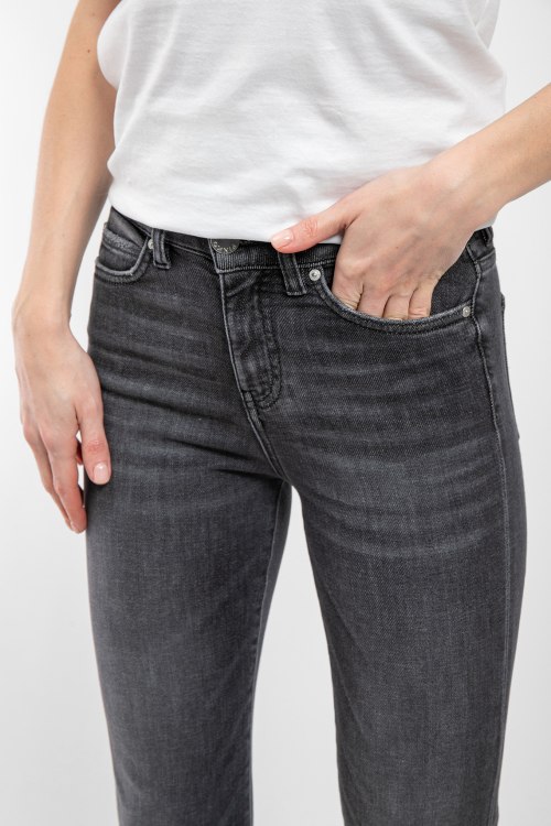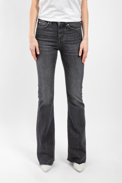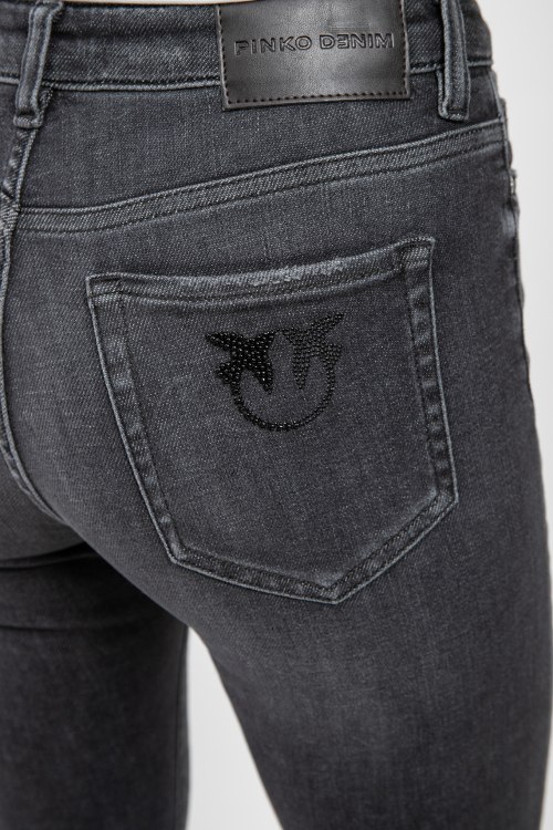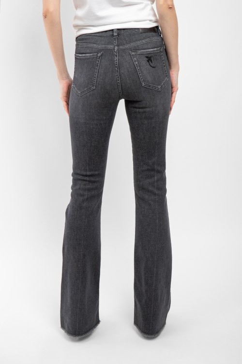 Женские серые джинсы Flora из хлопкового микса от Pinko (Пинко). Классическая длина, средняя посадка, застежка на молнию и пуговицу, пять карманов, петли в поясе для ремня, логотип бренда на заднем кармане, расклешенная модель книзу.