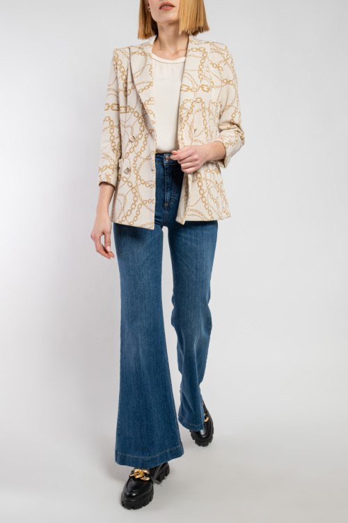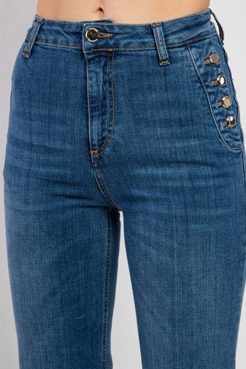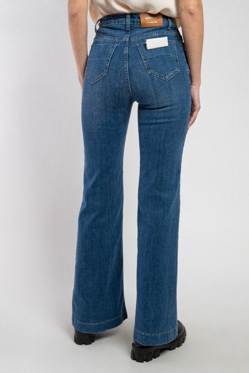 Женские синие джинсы от Kocca (Кокка). Боковые карманы на пуговицах, два кармана сзади, золотистая фурнитура, пояс с петлями для ремня, нашивка с логотипом сзади на поясе, расклешенный фасон, застежка на молнию и пуговицу, полная длина
