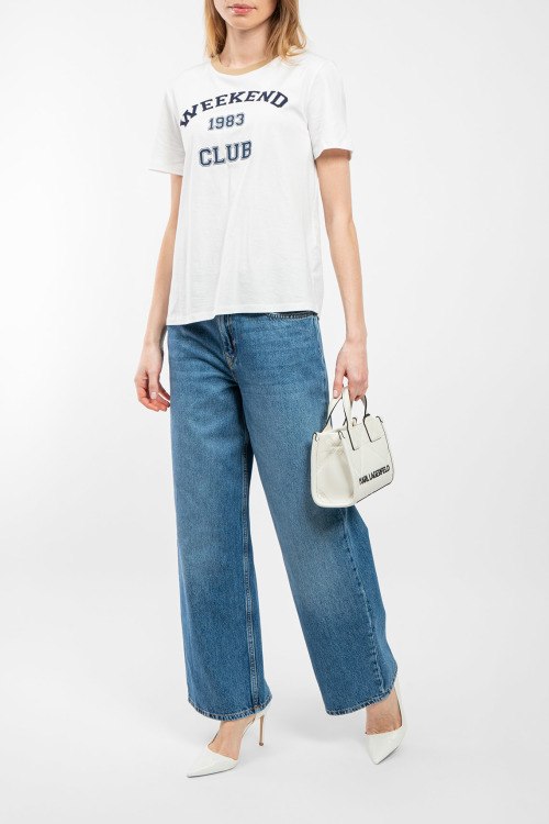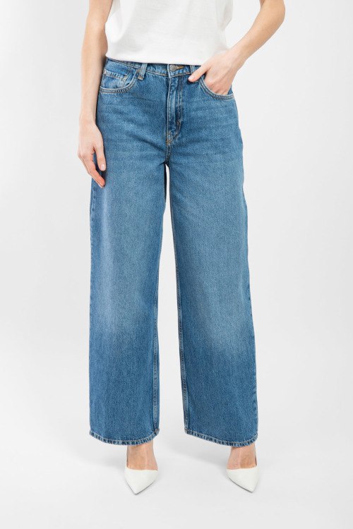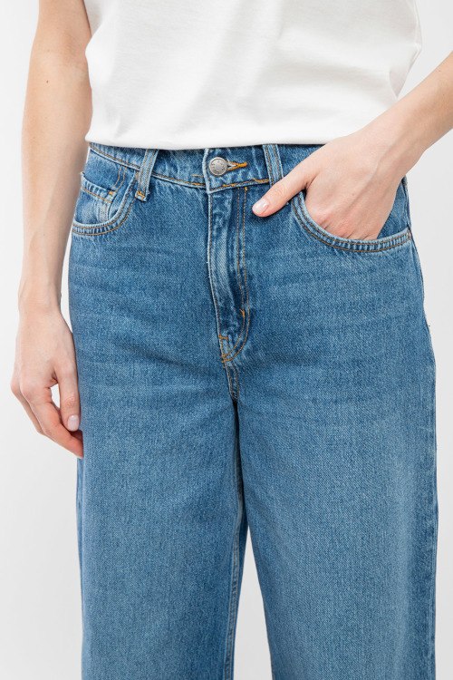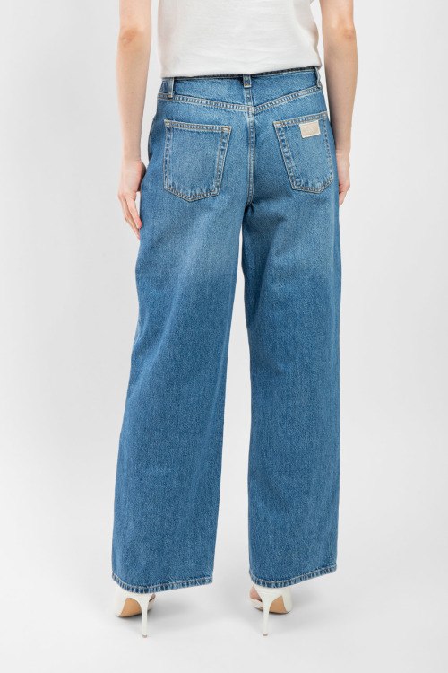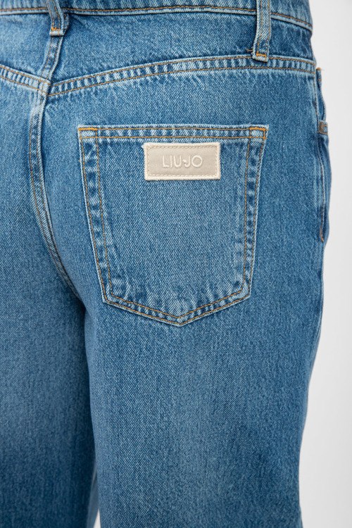 Женские синие джинсы из полиэстера и хлопка от Liu Jo (Лиу Джо). Расклешенная модель, высокая посадка, застежка на молнию и пуговицу, пять карманов, петли в поясе для ремня, патч-лого.