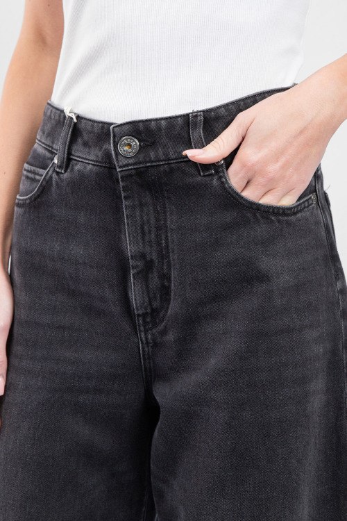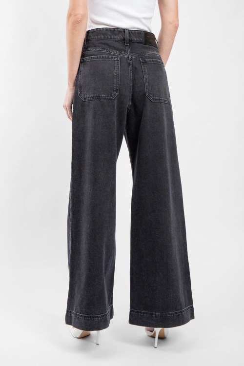 Женские темно-серые джинсы-палаццо Cactus от Max Mara Weekend (Макс Мара Викенд). Пяти-карманная модель, пояс с петлями для ремня, нашивка с логотипом сзади на поясе, широкий крой, полная длина.