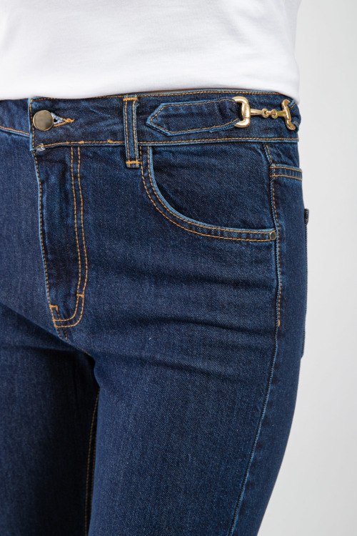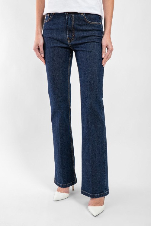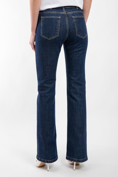 Женские темно-синие джинсы из хлопкового микса от Barbara Alvisi (Барбара Алвиси). Классическая длина, средняя посадка, застежка на молнию и пуговицу, пять карманов, петли в поясе для ремня, металлическая фурнитура золотистого цвета. Замеры для разера 42: длина 106 см, ширина по талии: 33 см, ширина по бедрам: 40,5 см, высота сидения: 32 см, ширина штанины вверху: 24 см. Ткань тянется, пояс на резинке.