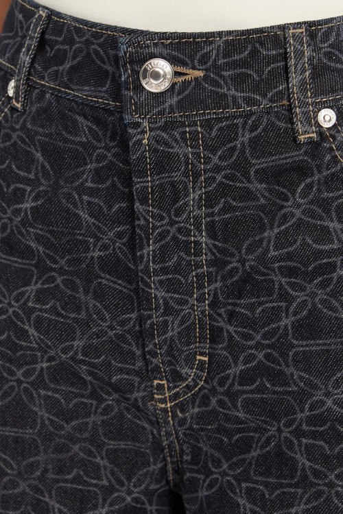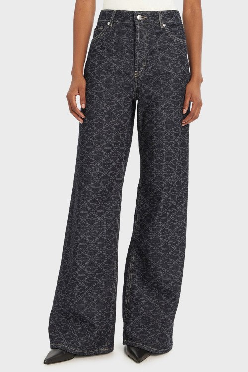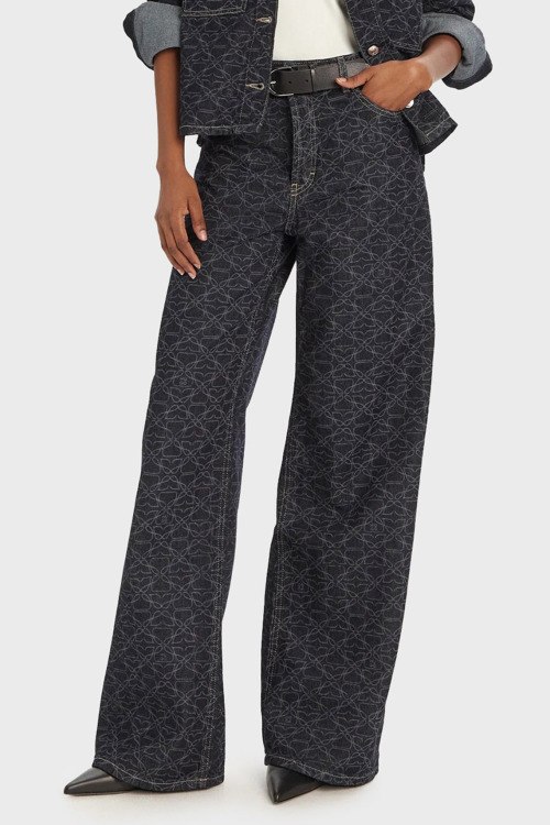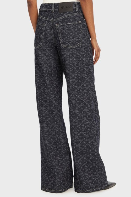Детали: Женские темно-синие джинсы от Hugo by Hugo Boss (Хуго бай Хуго Босс). Пяти-карманная модель, узор по всей поверхности, пояс с петлями для ремня, нашивка с логотипом сзади на поясе, крой Wide Leg, полная длина