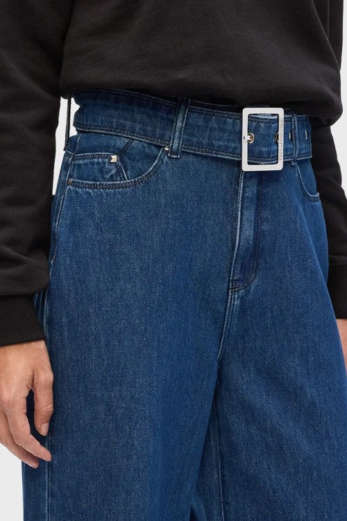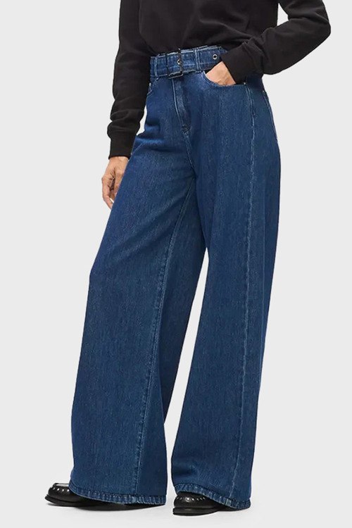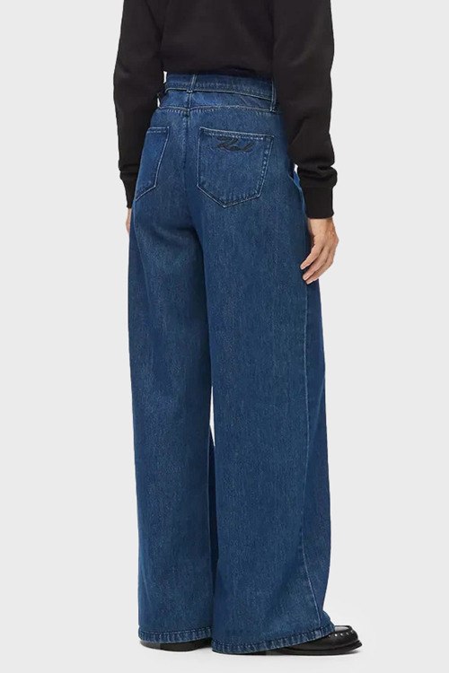 Детали: Женские темно-синие широкие джинсы от Karl Lagerfeld (Карл Лагерфельд). Пяти-карманная модель, пояс с металлической пряжкой, вышитый логотип на заднем кармане, широкий крой, полная длина