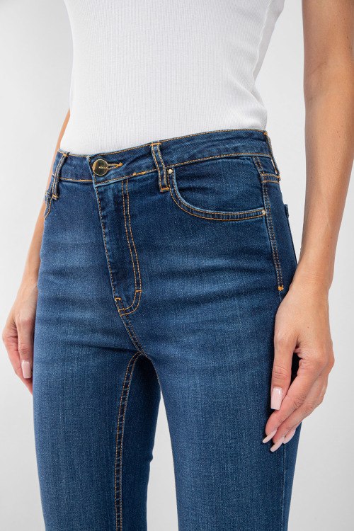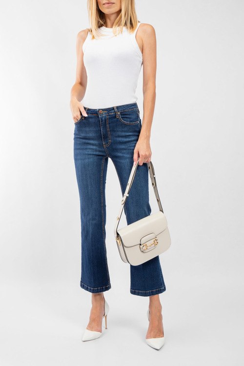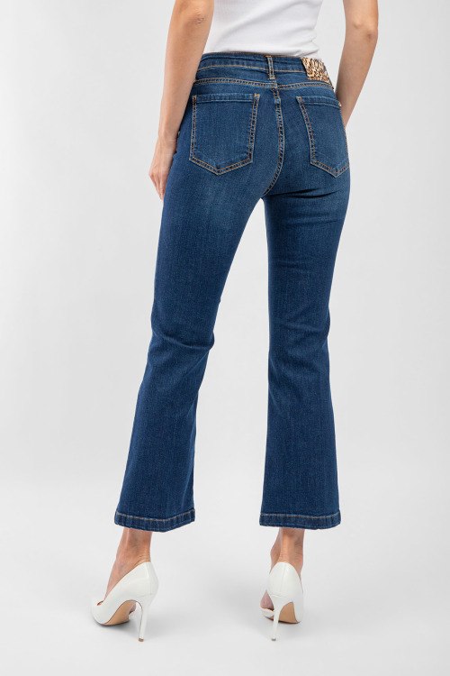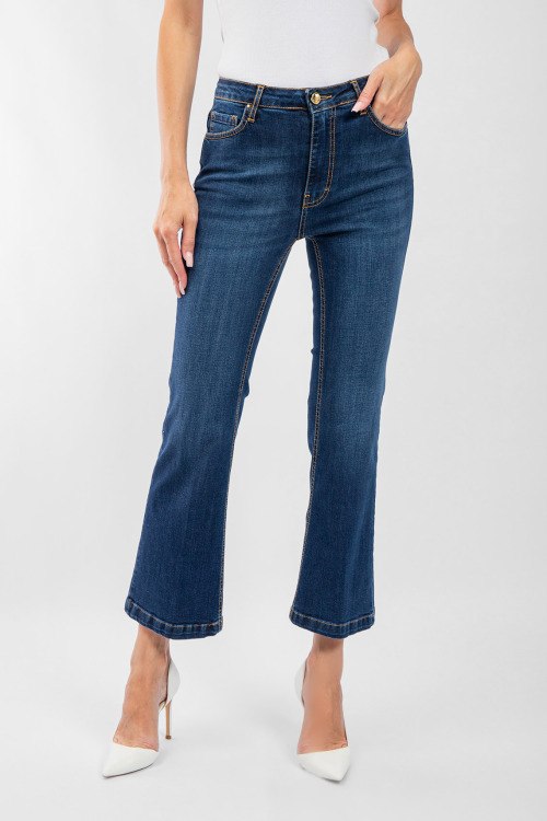 Женские темно-синие расклешенные джинсы от Kocca (Кокка). Пяти-карманная модель, пояс с петлями для ремня, нашивка с логотипом сзади на поясе, расклешенный крой, укороченная длина.