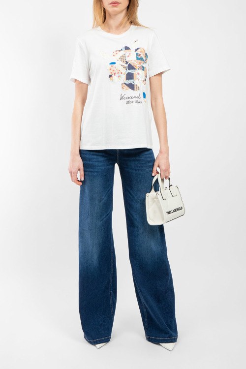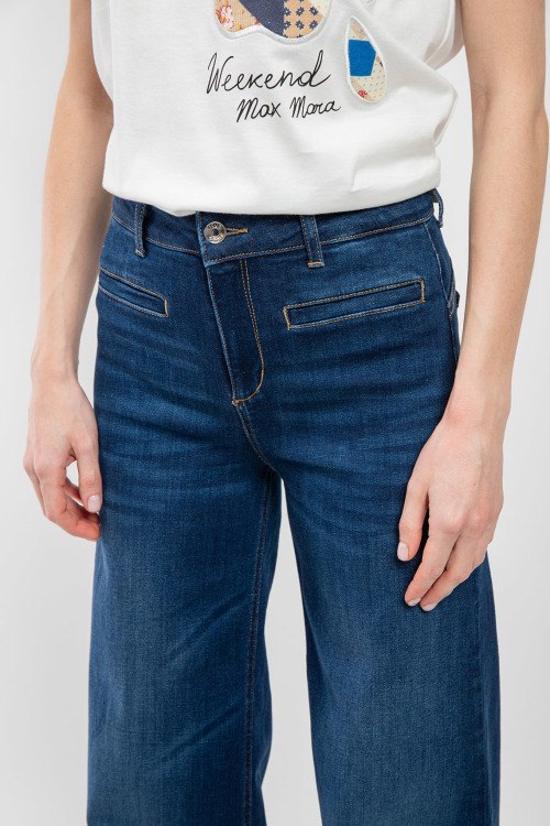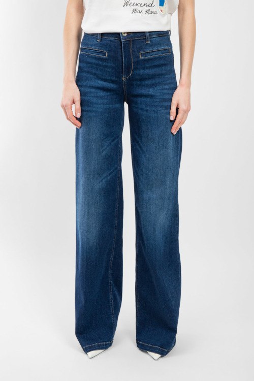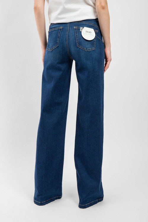 Женские темно-синие джинсы из хлопка от Liu Jo (Лиу Джо). Модель Flare fit, расклешенная модель, высокая посадка, застежка на молнию и пуговицу, прорезные карманы, петли в поясе для ремня.