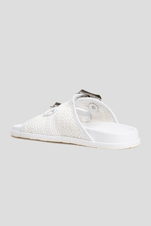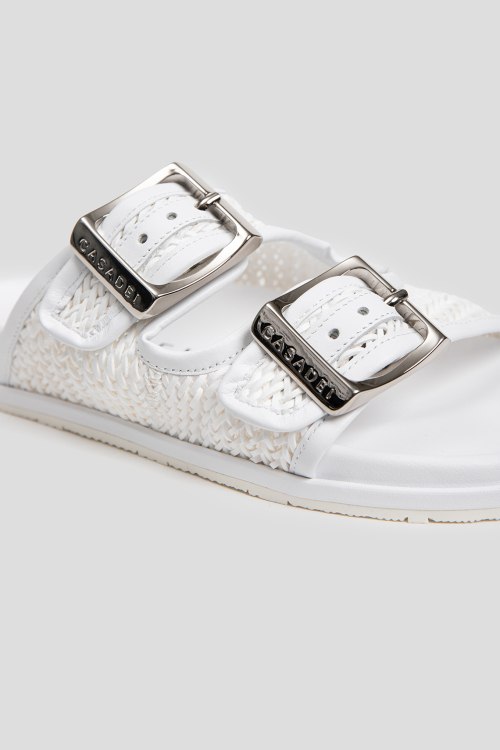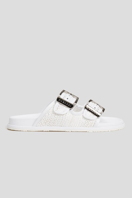 Детали: Женские белые шлепанцы из экокожи от Casadei (Касадей). Закругленный носок, регулируемые ремешки, металлические прядки, тиснение с логотипом бренда, плоская подошва, плетенный дизайн