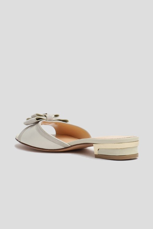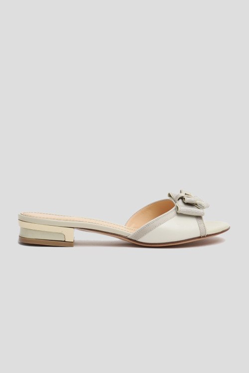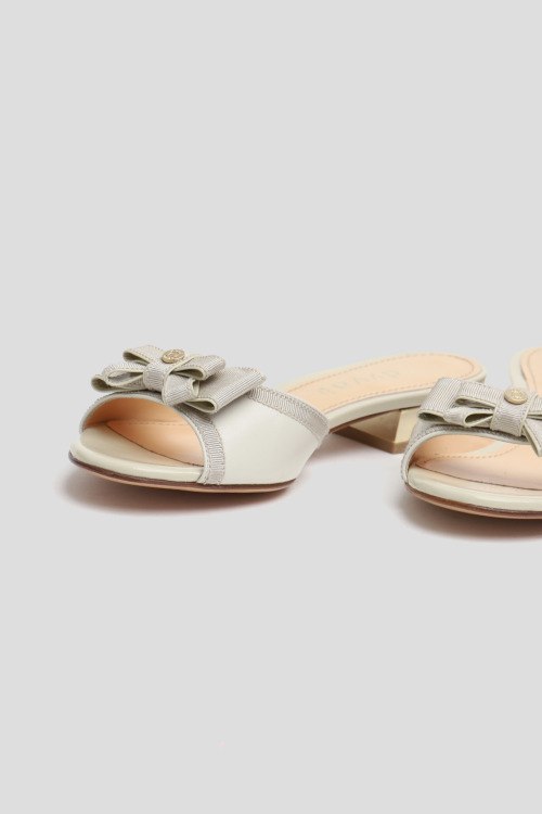 Детали: Женские шлепанцы молочного оттенка из кожи от Dyva (Дива). Закругленный носок, небольшой каблук, кожаная стелька с логотипом бренда, декор: спереди бант с металлической фурнитурой. Измерения: высота каблука: 2,5 см (на размер 36)