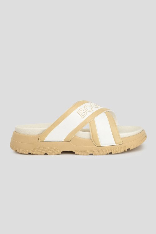Детали: Женские бежевые шлепанцы San Jose от Bogner (Богнер). Ремешки крест-накрест, принт с логотипом, закругленный носок, бежевая подошва