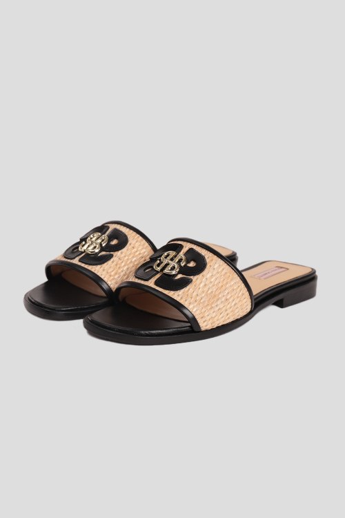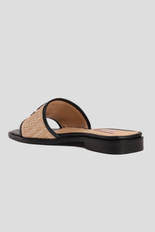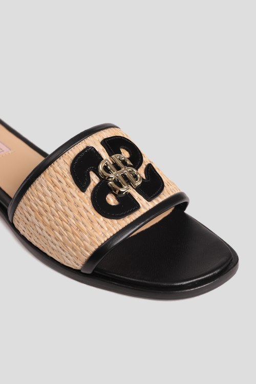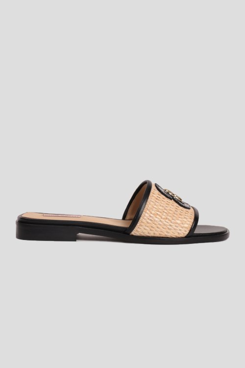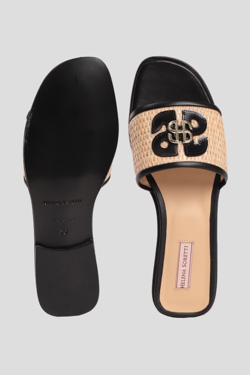 Детали: Женские черно-бежевые шлепанцы из шлифованной соломы и натуральной кожи от Helena Soretti (Хелена Соретти). Комбинация цветов и материалов, широкий ремешок спереди с логотипом бренда, кожаная стелька
