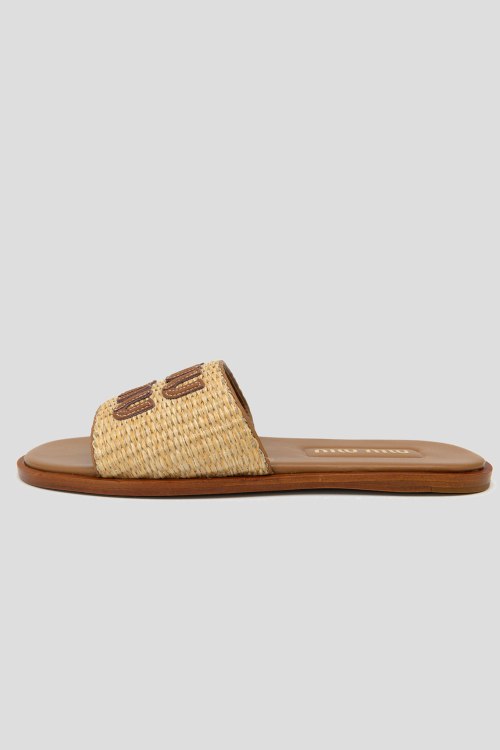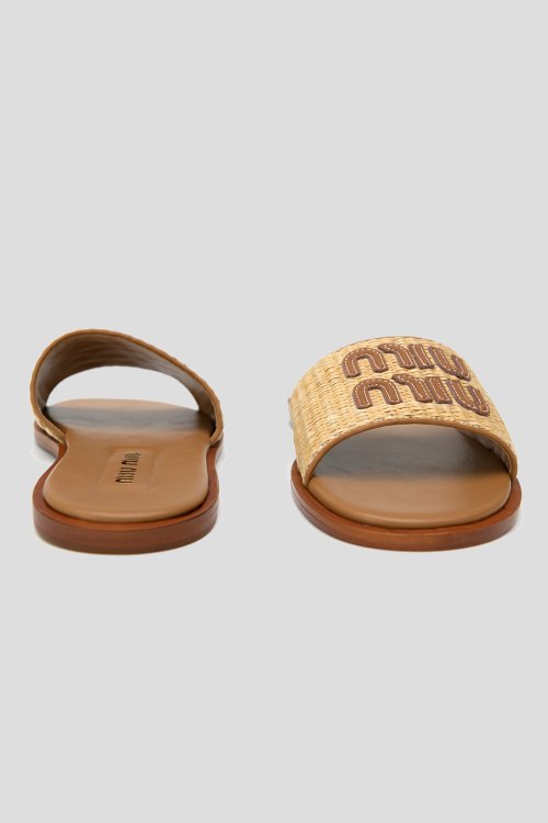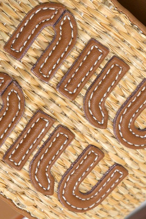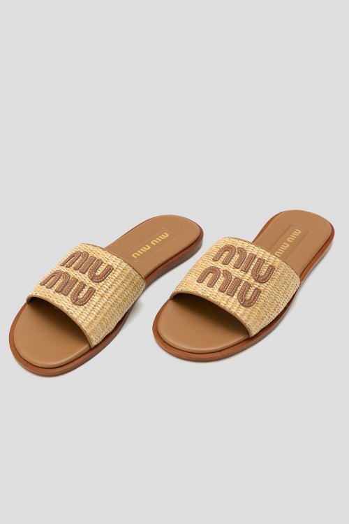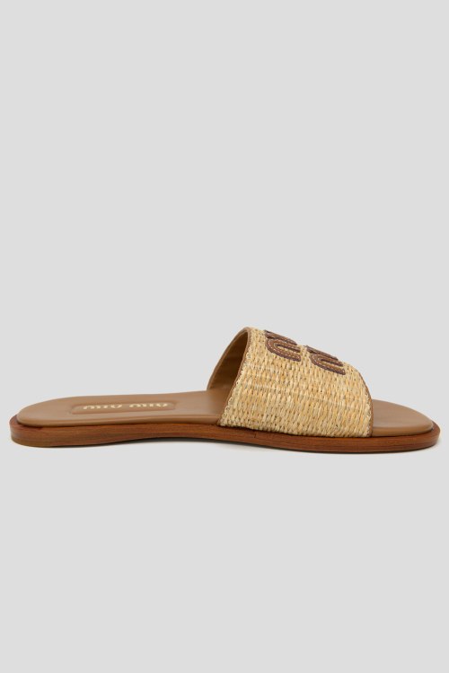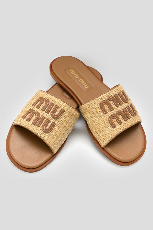 Детали: Женские бежево-коричневые шлепанцы из рафии от Miu Miu (Миу Миу). Широкий ремешок с нашивкой логотипа, закругленный носок, кожаная стелька, плоская подошва