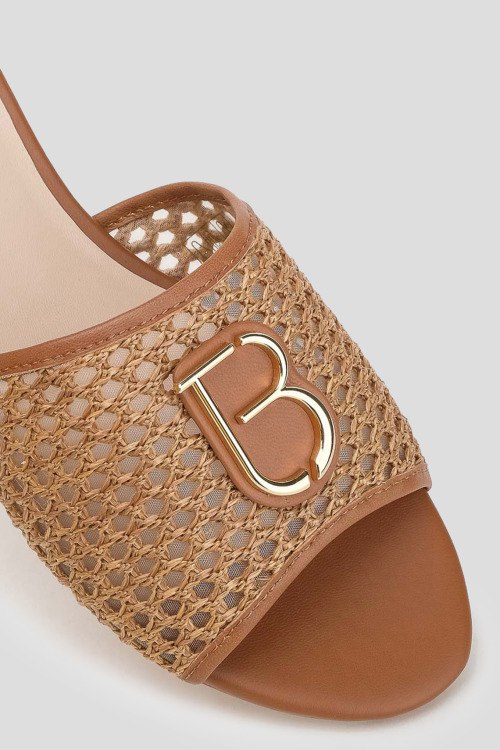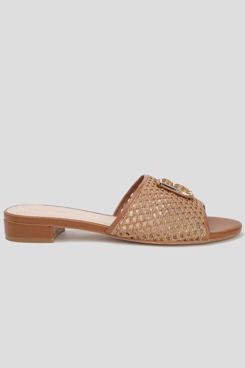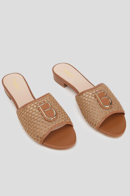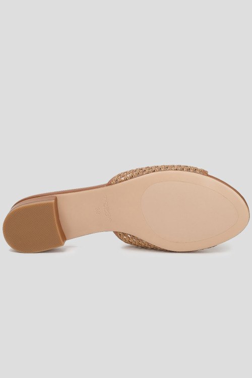 Детали: Женские бежево-коричневые текстильные шлепанцы от Tosca Blu (Тоска Блу). Широкий плетеный ремешок, золотистая фурнитура, закругленный носок