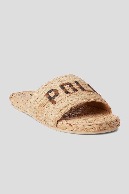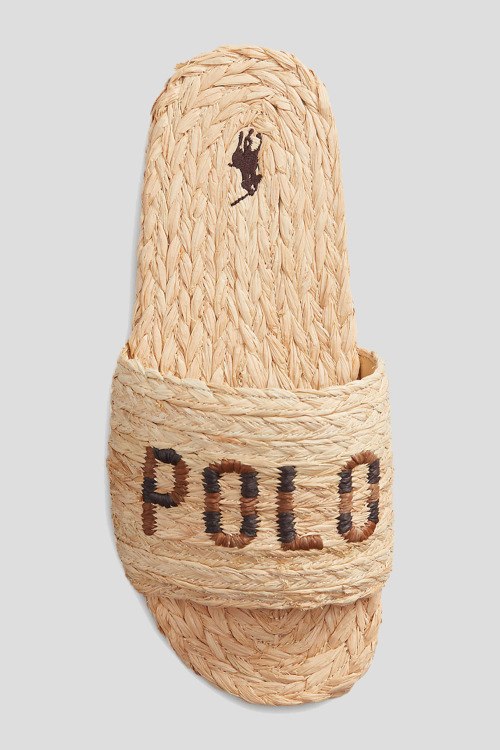 Детали: Женские бежевые шлепанцы Polo от Ralph Lauren (Ральф Лорен). Плетеный дизайн, широкий ремешок с логотипом, закругленный носок, плоская подошва
