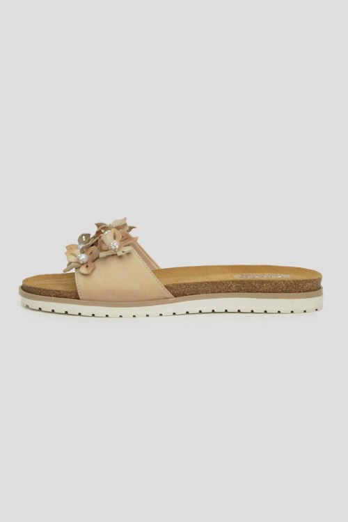 Детали: Шлепанцы бежевого цвета из натуральной кожи. Контрастная рельефная подошва, украшены спереди нашивкой
