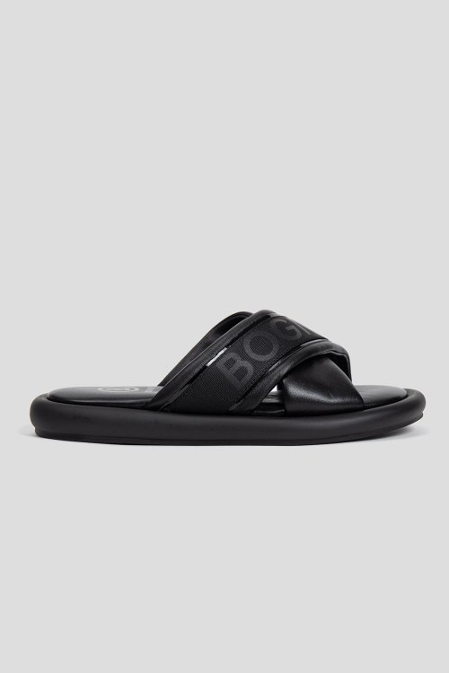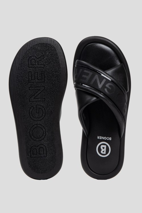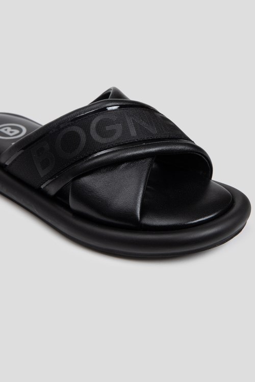 Детали: Женские черные шлепанцы из натуральной кожи от Bogner (Богнер). Закругленный носок, перекрестные ремешки, логотип бренда, кожаная стелька, плоская подошва