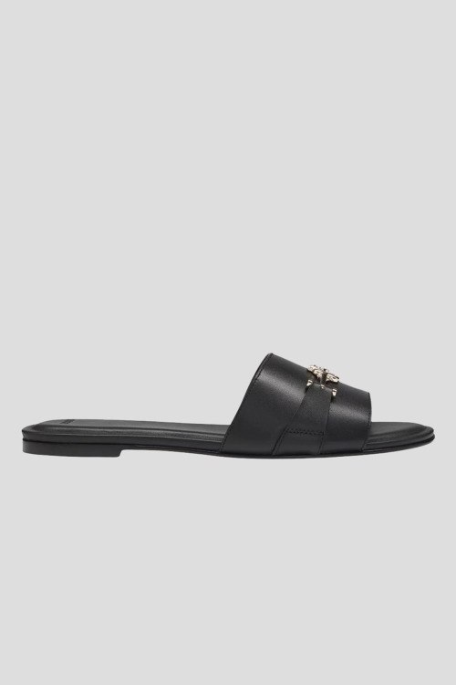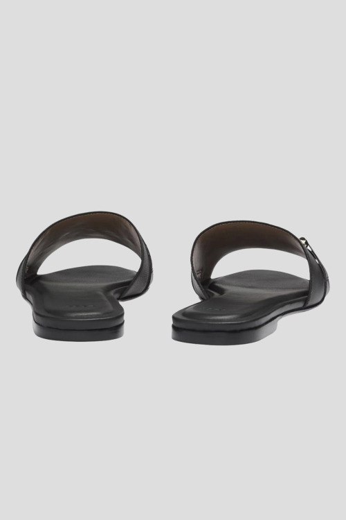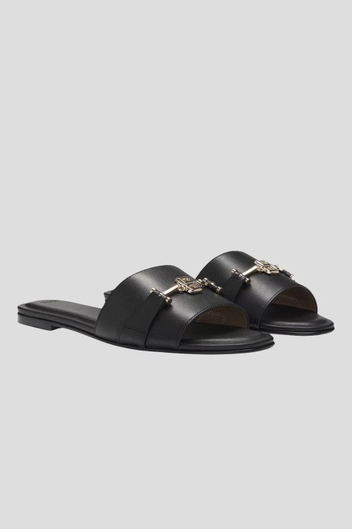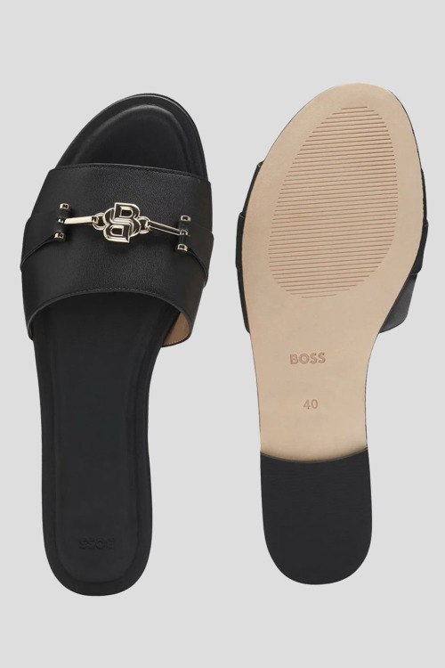 Детали: Женские черные кожаные шлепанцы Emberlyn от Hugo Boss (Хуго Босс). Модель из гладкой кожи, широкий ремешок с металлическим логотипом ВВ, миндалевидный носок, плоская подошва