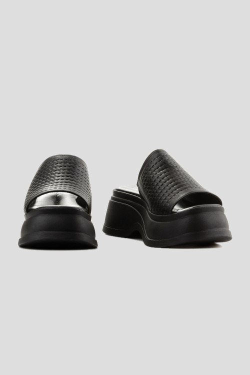 Женские черные кожаные шлепанцы от Ilvi (Илви). Широкий ремешок с перфорацией, квадратный носок, завышенная платформа, кожаная стелька. Полнота модели: средняя. Замеры стельки: р.36 (23,5 см),р.37 (24 см),р.38 (24,5 см),р.39 (25 см),р.40 (25,5 см),р.41 (26 см),р.42 (26,5 см)