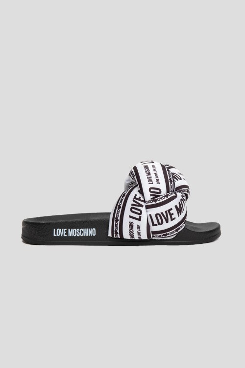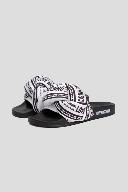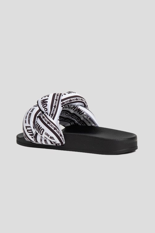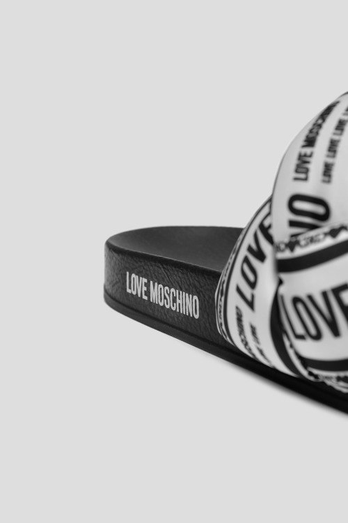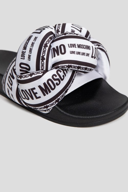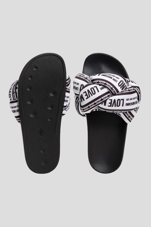 Детали: Женские черно-белые шлепанцы из полиэстера и эластана от Love Moschino (Лав Москино). Закругленный носок, анатомическая стелька, широкий ремешок с объемным декором, логотип бренда
